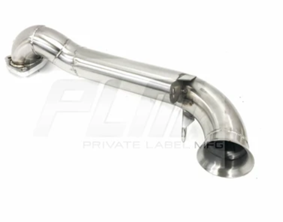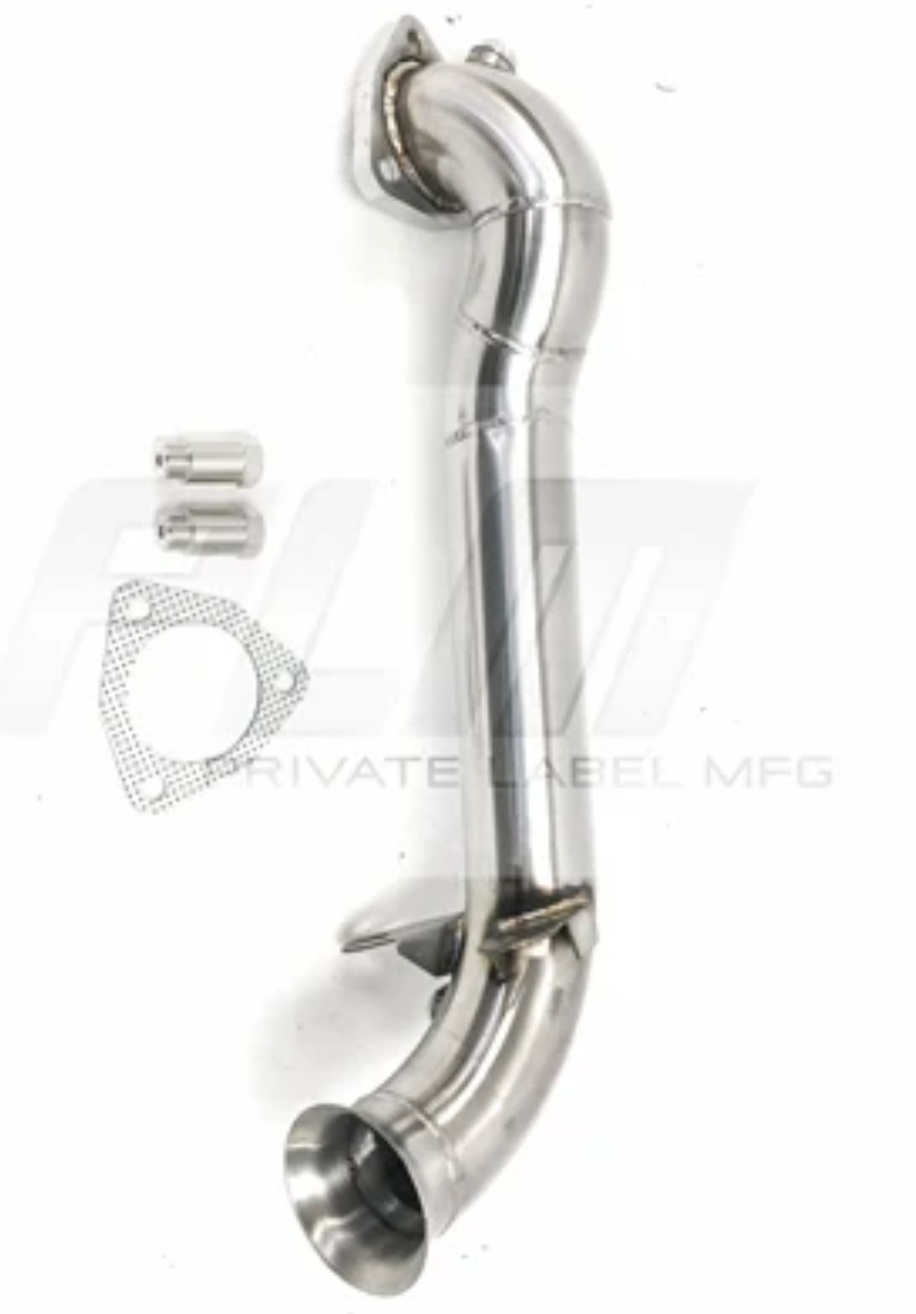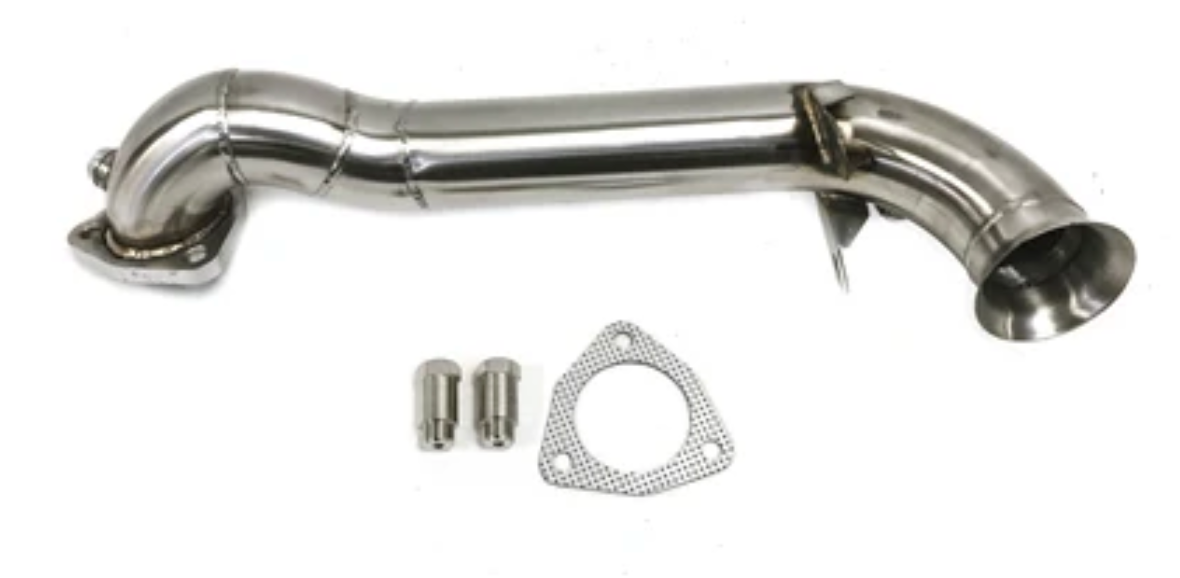 The down pipe delivers low to mid end power, and more power up top as the boost goes up. Air flows smoothly through mandrel bent stainless. No modifications are needed as it is a direct bolt-on unit to the OEM exhaust cat-back location.