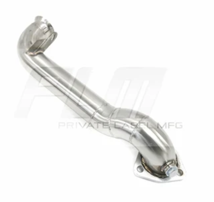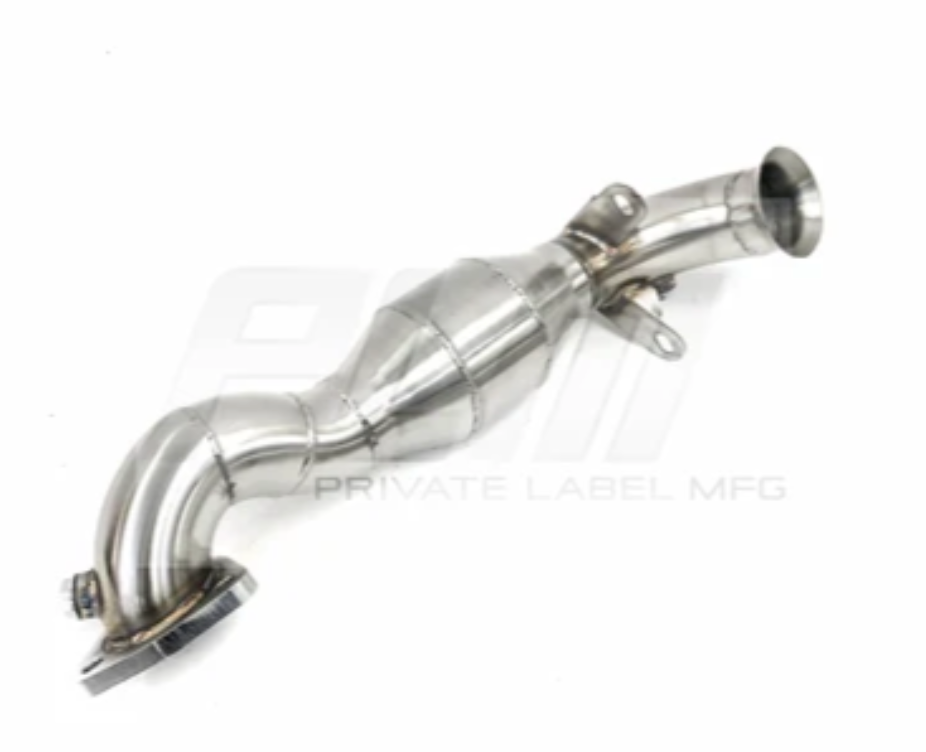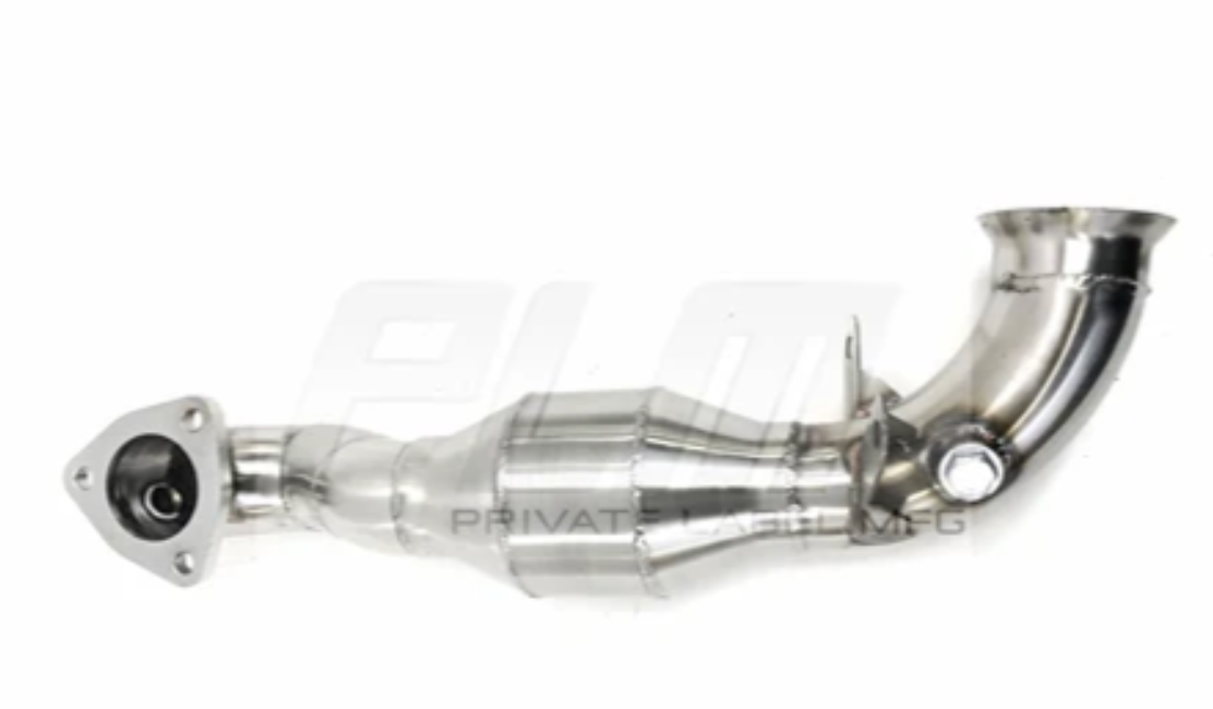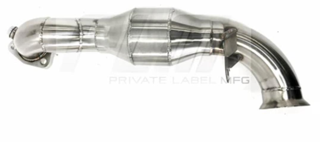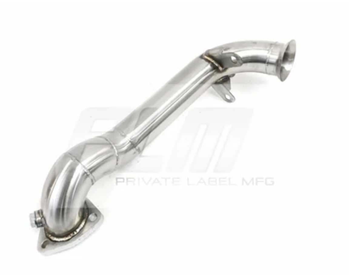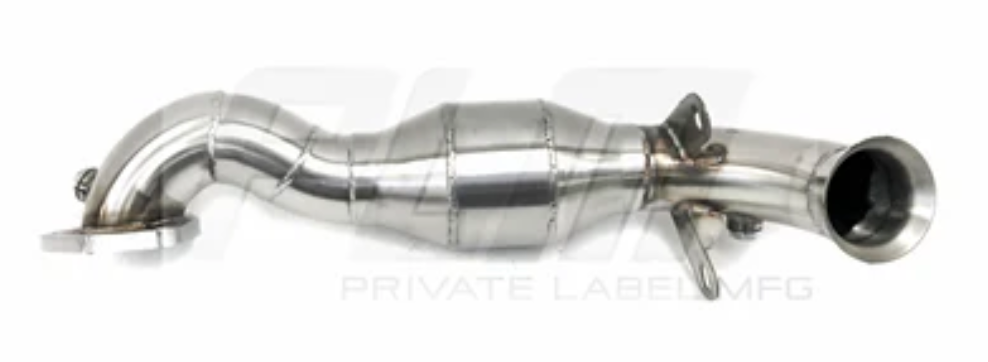 Private Label Mfg. Power Driven 2007 - 2014 Mini Cooper Downpipe features a 2.5" inch outlet which is manufactured from high quality stainless steel for superior heat resistance and strength. Unleash the potential of your motor with our high flowing 2.5" down-pipe.