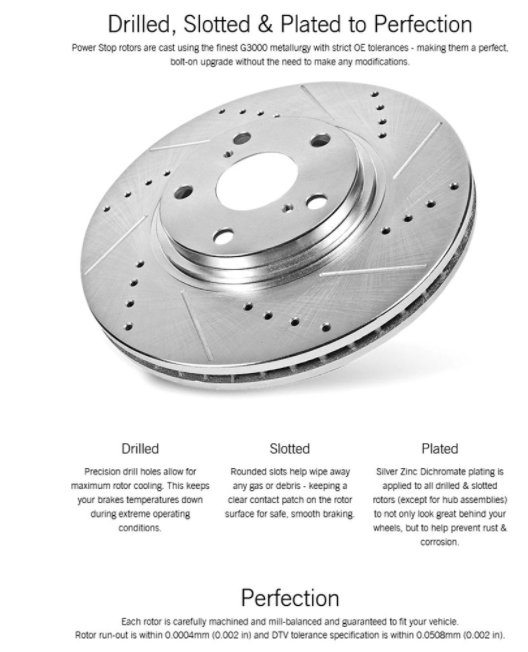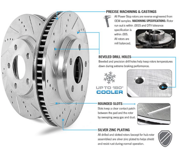 All drilled and slotted rotors (except for hub and rotor assemblies) are silver zinc plated to helps shield and resist rust during normal operation