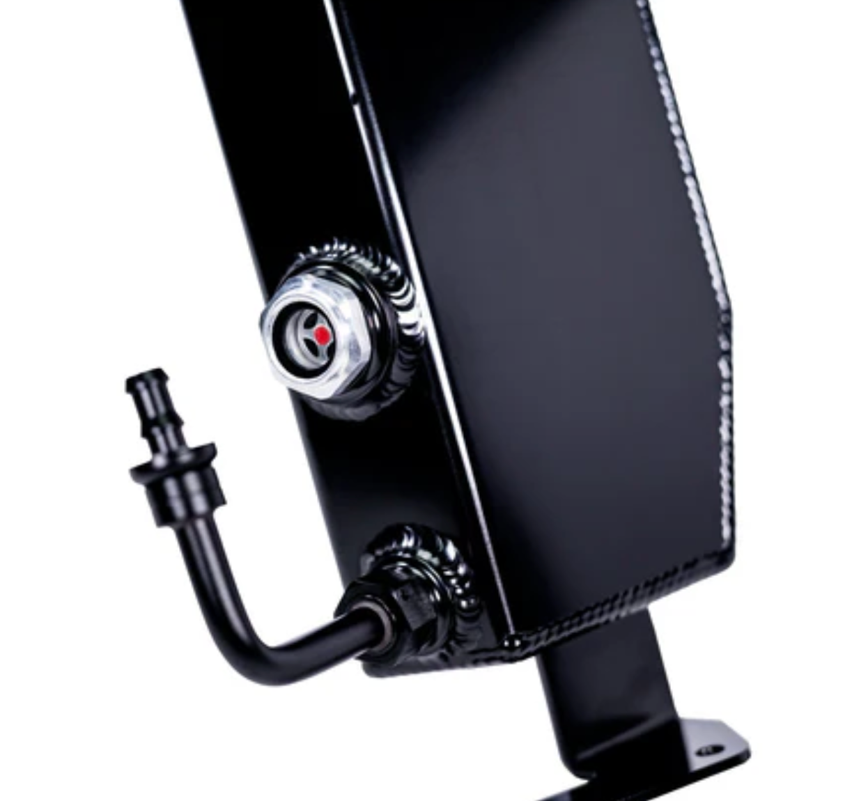 Our expansion tank is constructed of TIG-welded, 3mm thick aluminum and anodized gloss black durability. Each tank includes a billet aluminum cap, sight glass and custom lower fitting to fit the factory coolant line. This kit requires no modification for installation and reuses all factory hardware.