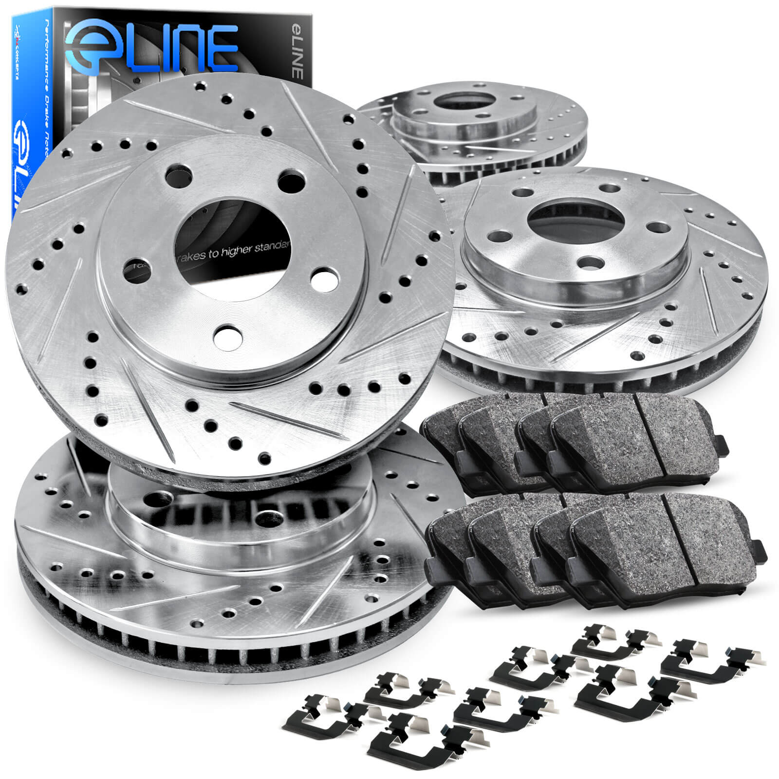 Cross-drilled rotors: Holes are drilled through the rotor to dissipate heat. Cross drilling is very effective for heat dissipation. It will prolong the life to the pads, rotors and improve stopping power. It also shed off water under-wet driving condition.