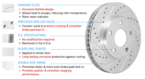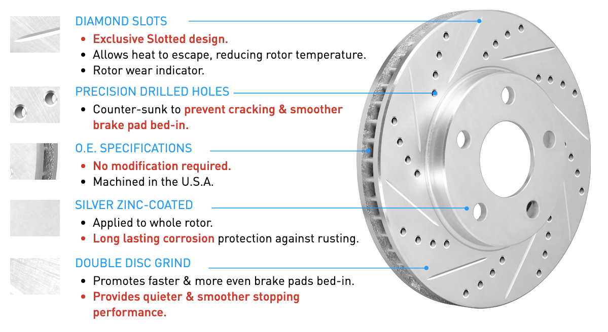 The primary reason diamond slot rotors are the best solution is that they run cooler, approximately 200-250 degrees cooler when used with high performance pads, This reduces the chances of warping, which has become a major problem in recent years, particularly on late-model, domestic vehicles. Additionally, you will experience improved wet-weather braking.