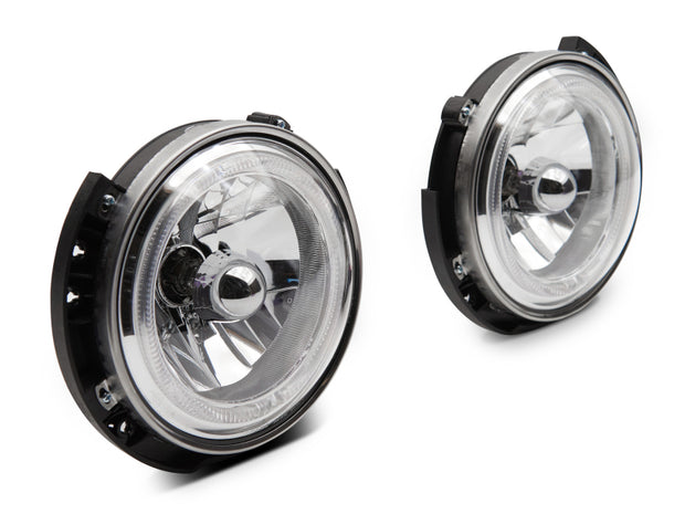 If your Wrangler's stock headlights are cracked, damaged, or yellowing replace them with a brand new set of Raxiom 7-inch Round Halogen Headlights. Designed to be a direct replacement for your factory headlamps, these DOT compliant, Headlights will light up the darkest trails and dimmest highways to ensure that the path ahead is safely lit. These Raxiom Headlights also feature Daytime Running Light (DRL) halo accents that add a cool custom appearance to your Wrangler, while improving your visibility to other drivers. These Raxiom Headlights employee premium, high output LEDs for use in the daytime running light accent halos. These stylish LED halo accents will ensure that you are visible day or night by distracted drivers. Designed to perform in the harshest of elements, these Raxiom Headlights feature a rugged plastic housing with a tough as nails hard coated clear polycarbonate lens. Each Headlight is weather sealed to prevent moisture from harming the state of the art electronics found inside. These Raxiom LED Headlights can take just about anything the trail and mother nature can throw at them. Raxiom designed their 7-inch Round Halogen Headlights to be a direct plug and play replacement for your Wrangler's original factory lights. Installation can be completed in under 30 minutes. It should be noted that the accent halo portion of the headlight will require splicing into your Jeeps running lights for operation. These Raxiom 7-inch Round Halogen Headlights will not only bring a fresh new look to your Wrangler, but they also meet or exceed the strict guidelines set forth by the U.S. Department of Transportation (DOT) and the Society of Automotive Engineers (SAE), making them legal for street use. These Raxiom Lights also feature a dust and waterproof rating of IP 67, which makes them perfect for use on the muddiest of trails.