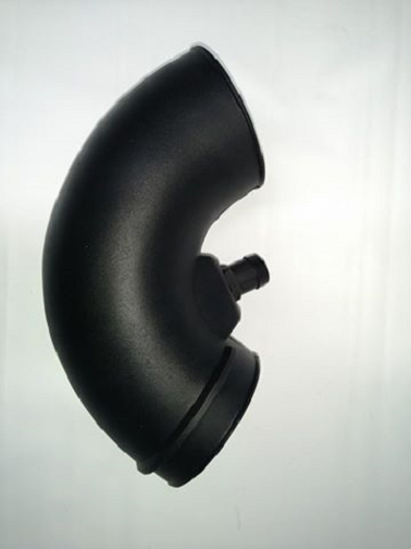 The duct work to the throttle body starts with a velocity stock duct section which fastens to the air box via five molded in brass inserts and stainless steel screws. The filter side has a huge 6 inch diameter clamping surface which accepts our oversize filter. Passing through the air box, the duct features a generous radius which transitions to 4.25 inch to accept the OEM MAF sensor. On the engine side of the MAF sensor we use a high gloss black silicone hump hose to absorb motor rock. Next is our inlet elbow which has nearly a 4 inch ID, a generous radius throughout its length and a molded in brass bung to accept the PCV hose fitting. Our inlet elbow OD is larger than the OD of the throttle body; therefore, we use a high gloss black silicone reducing coupler to join the throttle body. Stainless steel hose clamps and a silicone PCV hose complete the system. From start to finish, Roto-fab has strived to provide the highest quality products possible in a package that performs well, looks good and fits your car as it should.