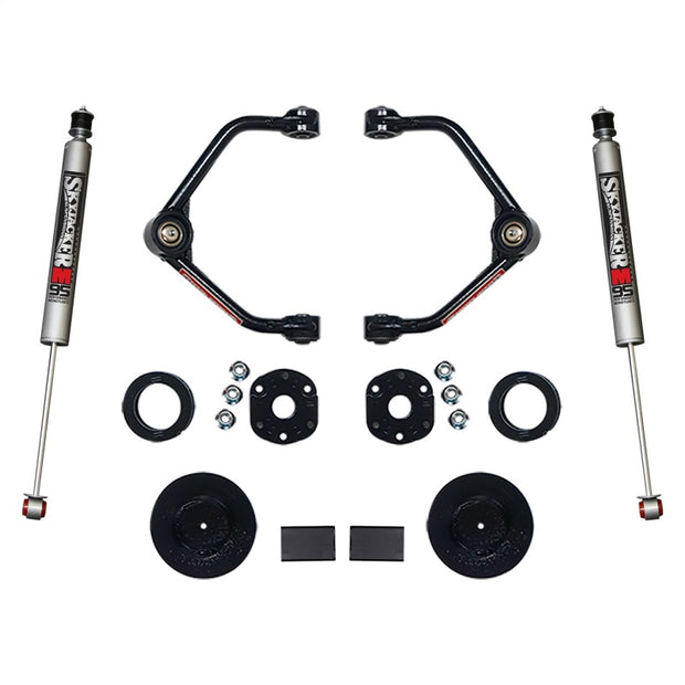 Skyjacker's new 3 In. Upper Control Arm lift kits for the 2019 and up Ram 1500s offer easy installation and an assertive look that provides you with confidence in your Ram 1500. Give your truck the stance and look it wants with Skyjacker's 3 In. Upper Control Arm lift kits. This lift kit comes with a set of Upper Control Arms that are made out of high-strength DOM tubing to withstand extreme amounts of stress and loads, and a gusset plate stiffener is welded in between the Control Arms for added rigidity and strength. You will also optimize and improve the steering geometry and strength of your vehicle with a pair of Skyjacker Upper Control Arms. With the revised steering geometry you get increased suspension travel, and our Upper control arms are manufactured in-house in the USA. Our UCA's include an optimum pivot ball joint for improved flexibility and to reduce stress. The ball joints are greasable to increase service life. You are not only increasing on-road handling but also off-road strength and capability when you choose a set of Skyjacker Upper Control Arms. This lift kit also comes with front strut spacers so you can keep your factory ride and rear coil spring spacers, bump stop spacers, and M95 Monotube shocks to provide lift and a comfortable ride in the rear of the truck. With this set up you gain enough clearance to run 33 In. tires to gain a clean and assertive look from the front to the rear of this truck. This Skyjacker 3 In. Upper Control Arm lift kit comes with everything you need to give your truck the upper hand. This lift kit is 100% bolt-on, which does not require any cutting, welding, or drilling. This also means you can return to stock at any time if you would like to. Common tools and a home garage is all you need for this lift kit. Comes with Skyjacker's limited lifetime warranty.