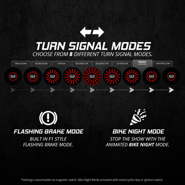Ditch the ordinary! XKGLOW's Pro Series MotoTurnz deliver iconic halos with a modern twist. Tap a magnet to the lens for instant access to 8 different running light settings and 8 turn signal modes, changing your look in seconds, its that easy. Activate Bike Night Mode for head-turning animations by flipping the ignition on/off. Upgrade your ride with XKGLOW and steal the show.
