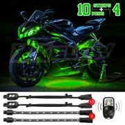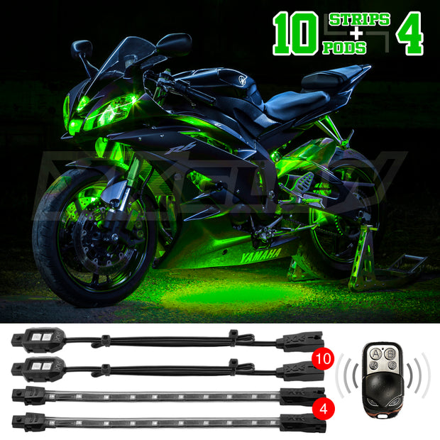 XK Glow Strips Single Color XKGLOW LED Accent Light Motorcycle Kit Green - 10xPod + 4x8In